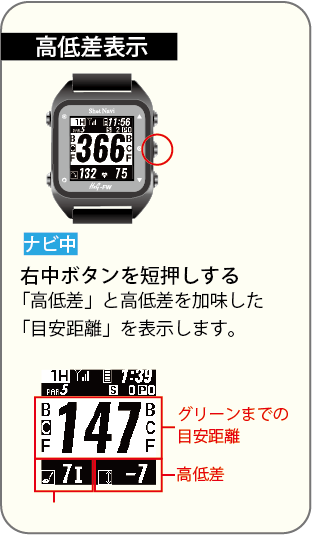 シンプルビューやハザード、グリーンビュー、スコアビューなど、ビュー(ナビ機能)の切替を行う場合は、左下のボタンを長押しします。高低差情報の表示・非表示は右中ボタンを押します。