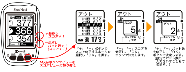 各種ナビ中に本体右側面の「+」ボタンを長押しするとスコアのカウントアップ、「-」ボタンを長押しするとパット数のカウントアップ(同時にスコアもカウントアップします)が行えます。入力したスコアの確認はスコアビューで行います。「電源」ボタンを押すとコースが切り替えられ、スコアの編集は「+」「-」ボタンで該当ホールを選択して「OK」ボタンを押します。各スコアは「+」「-」ボタンで入力し、最後に「OK」ボタンを押して保存します。