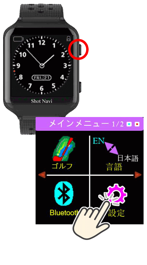 端末のほうでファームウェア更新準備をします。 時計モードの状態で右上のボタンを短押ししてメニューを表示して、「設定」をタッチします。