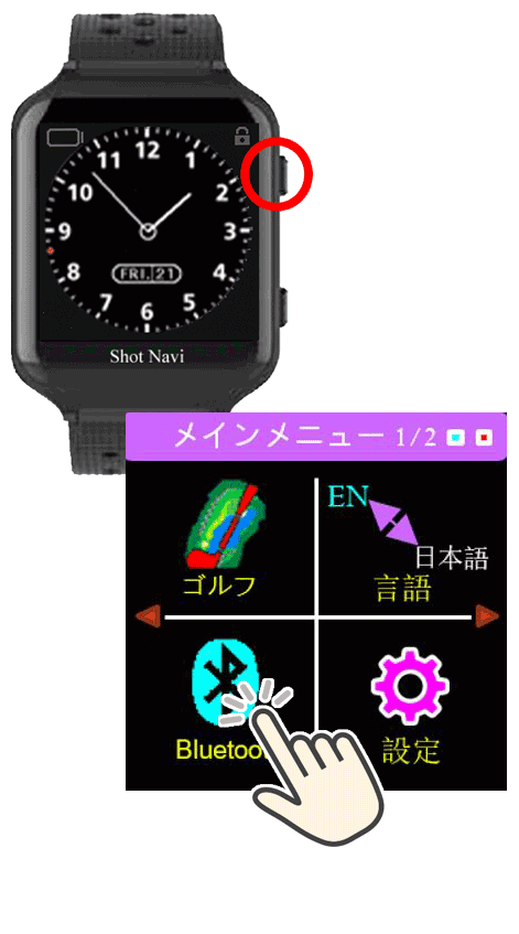 ※時計画面にロックがかかっている場合は、もう1度右上ボタンを短押ししてください。