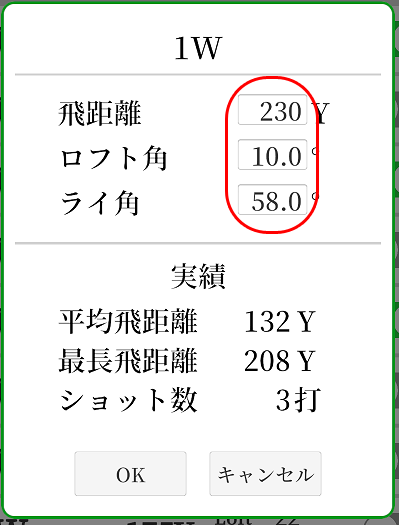 飛距離、ロフト角、ライ角が変更できるようになるので、値を変更し、