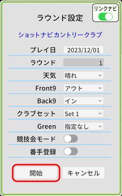 ナビ画面の表示はホームメニューの「ゴルフ場検索」からゴルフ場を選択し、ラウンド設定で「開始」を押します。