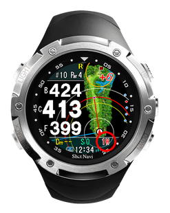ピンポジションデータが存在すると、グリーンセンターまでの表示(C)がピンポジションまでの表示(P)になり、旗の色が水色になります。