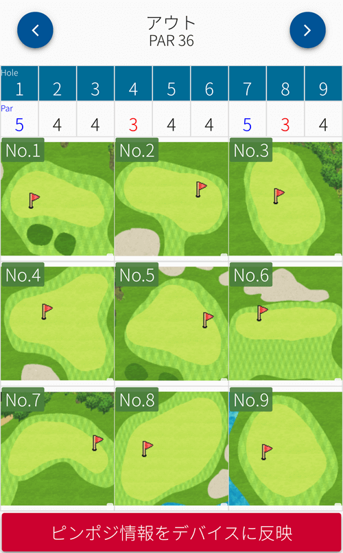 ゴルフ場情報の画面に戻るとピンポジションが追加されているので選択します