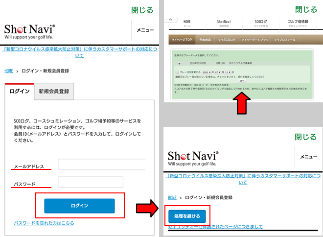 ShotNavi会員登録をしているメールアドレスパスワードを入力し 、ログインを押してください。