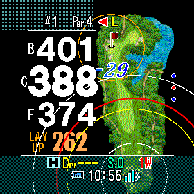 ピンポジションデータが存在すると、グリーンセンターまでの表示(C)がピンポジションまでの表示(P)になり、旗の色が水色になります。
