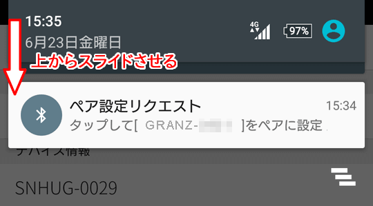 接続処理中に、画面左上にBluetoothのマークが出てきたら、指で画面上から下に向かってなぞるようにし、通知バーを表示します