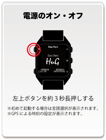 電源のオンは左ボタンを長押しします。電源オフは時計画面にて左ボタンを長押し(3秒以上)するか、メニューより電源オフを選択します。