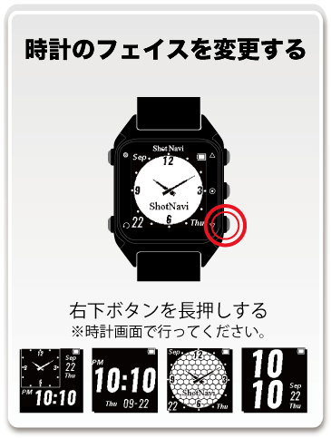 時計画面の表示を変更するには、右下ボタンを長押しします。アナログ・デジタル表示など5つのフェイスより表示を選択可能です。