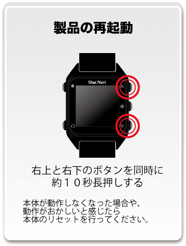 製品が動作しなくなった、フリーズしてしまった時は右の上下ボタンを同時に長押しします。起動ロゴが表示され、再起動が始まります。