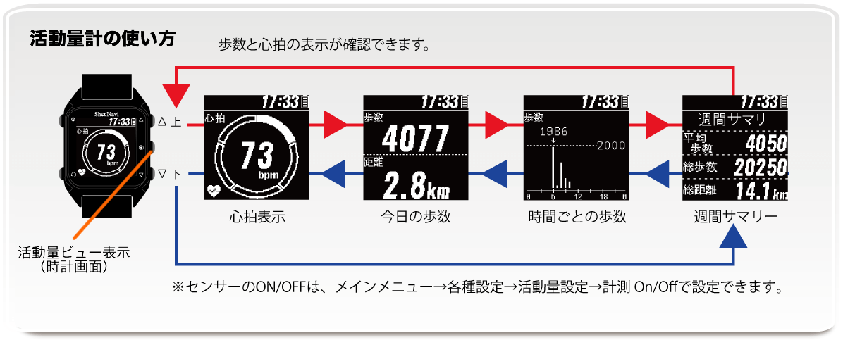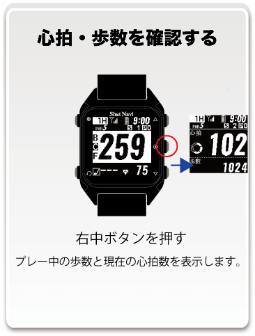 各ナビビュー画面にて右中(メイン)ボタンを短押しします。現在の心拍数とこれまでのプレー中の歩数を表示します。
