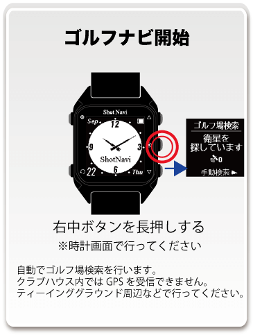 時計画面中に右中(メイン)ボタンを長押しします。GPS検索が始まり、現在地よりゴルフ場を自動で検索、ナビを開始します。また、自動で活動量計が起動します。
