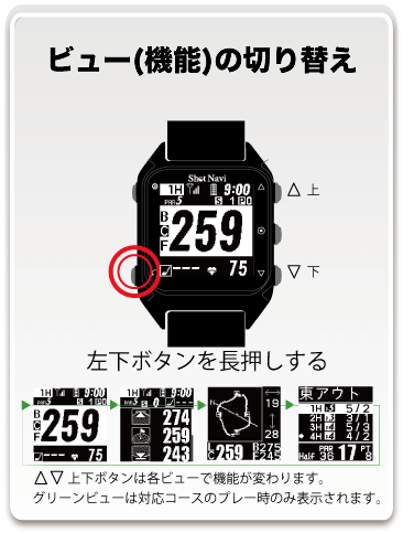 シンプルビューやハザード、グリーンビュー、スコアビューなど、ビュー(ナビ機能)の切替を行う場合は、左下のボタンを長押しします。