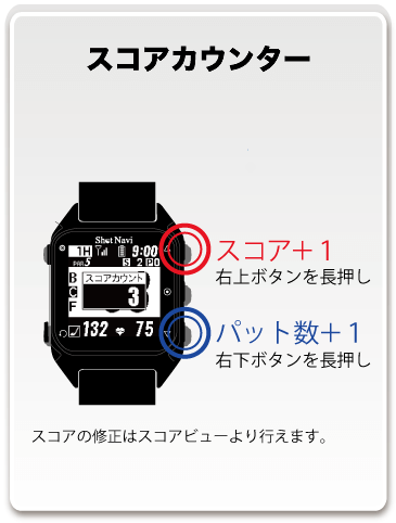 各ナビビュー画面にて右の上下のボタンを長押しします。右上はスコアのカウントアップ、右下はパット数のカウントアップを行います。(パットはスコア数も+1します)