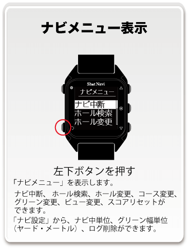 左下ボタンを短押しすると「ナビメニュー」を表示します。ナビメニューではホールやコースの切替、ナビ中断などの操作が行えます。
