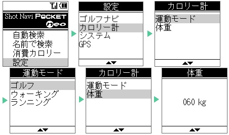 運動モードの ゴルフモード ではナビ画面中に移動した距離が消費カロリーとして計算されます。表示されるカロリーは徒歩で移動したものとして計算されます。