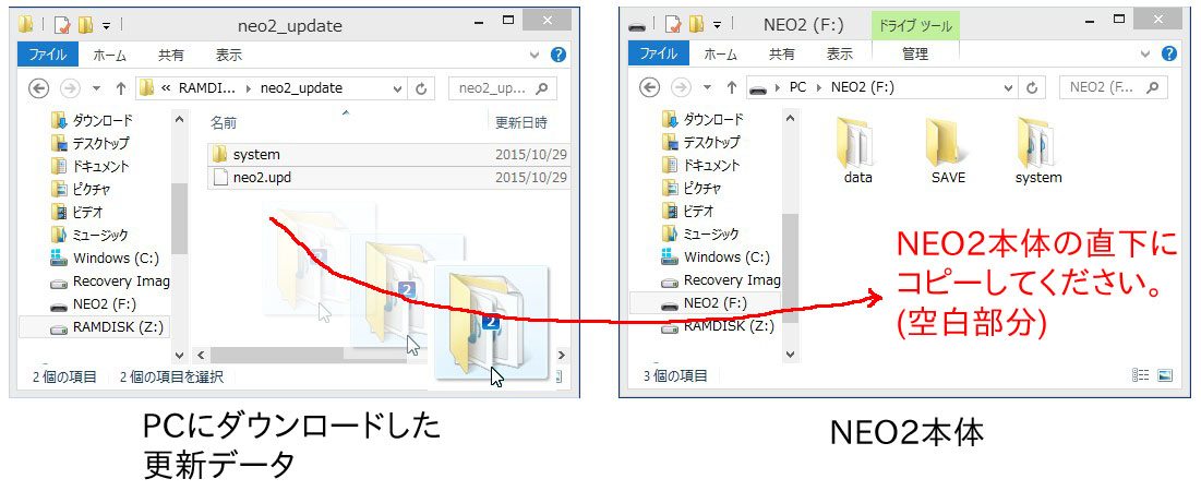 neo2.upd(存在する場合はsystemフォルダも一緒に) ファイルを選択し、ドラッグアンドドロップでコピーします。