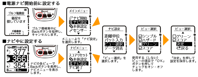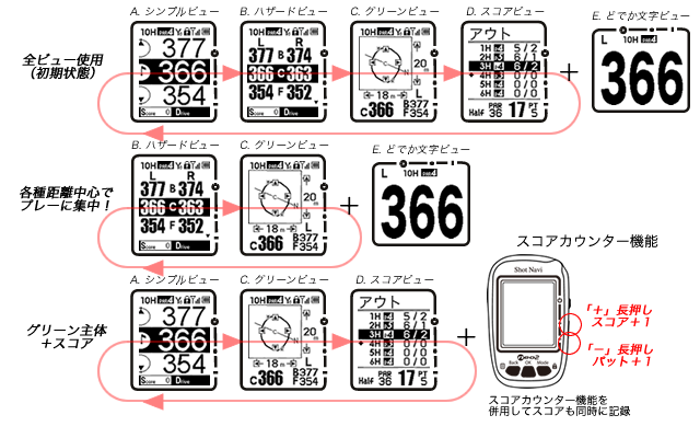 製品出荷時の初期状態では、各ビューが全て使う設定になっていますが、例えば2グリーン同時表示とハザード、グリーンビューだけが使いたいプレーヤーは他のビューの選択を外すことで普段使いたいビューのみの構成で利用可能です。●カスタマイズ方法
