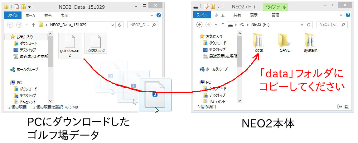 ダウンロードしたファイルをShot Navi NEOHP 本体の「data」フォルダに収録してください。