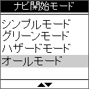 設定 → OK → ゴルフナビ → ナビ開始モード → オールモード または ハザードモード オールモード シンプルモード、グリーンモード、ハザードモードを 切替(▼)で表示する事が可能 ハザードモード ハザードモードの固定表示(他のモードは表示されません) (注) 表示方法の変更を行なわないと、ハザード情報は表示されません