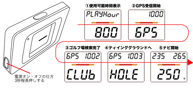 電源( サブ )ボタンを約 3 秒ほど押し続けると本体の電源が入り、使用可能時間が表示されます。その後、自動でGPSの受信を開始しGPS補足後後ゴルフ場を検索します。④の画面になりましたらティインググラウンドにお進みください。