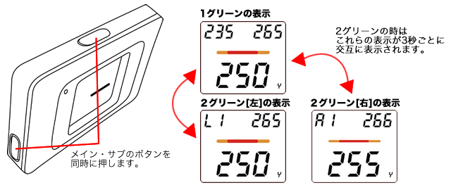 右グリーンの切替はメイン + 電源 ( サブ ) ボタンを同時に押します。(1グリーン時には作動しません。)2グリーンの場合は、選択グリーンの表示とフロントまでの距離が交互に3秒ごとに切替わって表示されます。