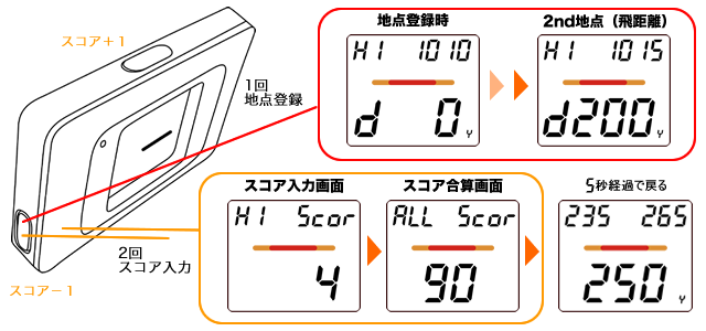 ●現在地点の登録および飛距離の計測を行うには、サブ(電源)ボタンを1回押します。地点登録後3秒おきに残距離と飛距離が交互に表示されます。●スコア入力を行うには、サブ(電源)ボタンを2回押します。スコアはメインボタンでカウントアップ、サブボタンでカウントダウンします。