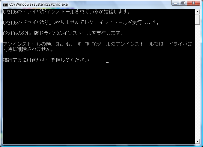 USBドライバのインストールが終わったら、黒いウインドウで何かキーを押してください。