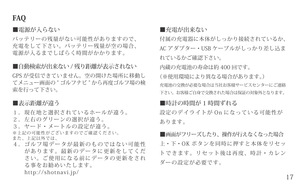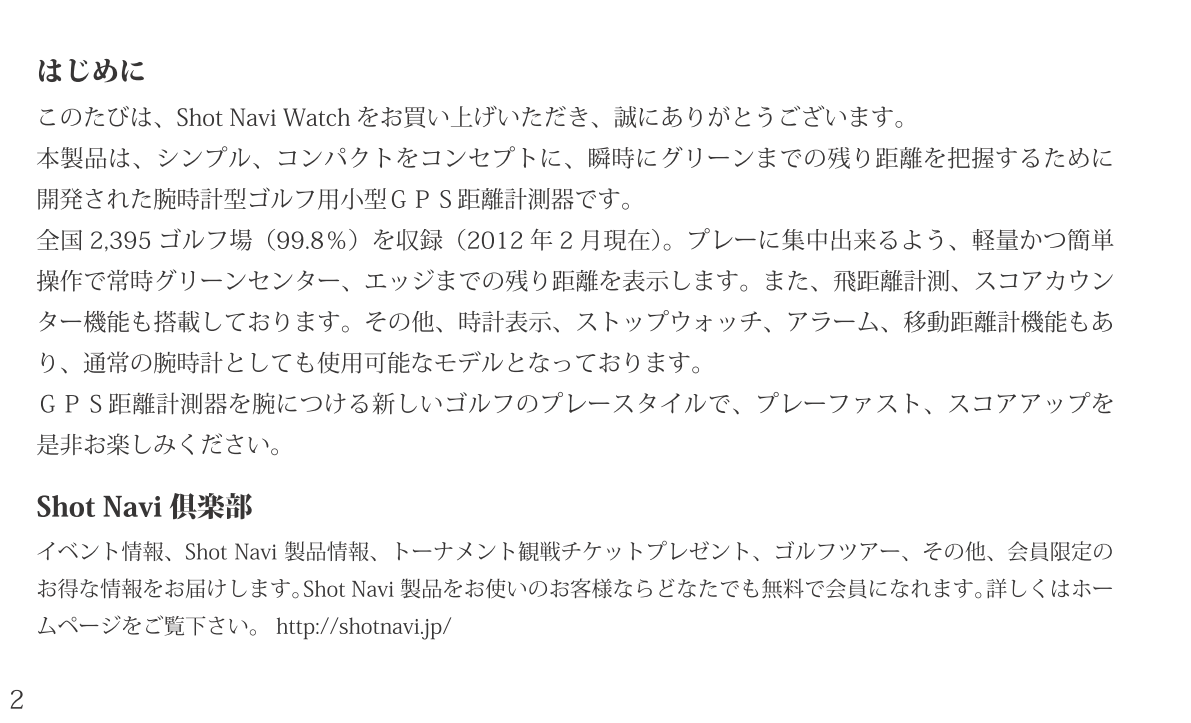 腕時計タイプ 製品概要 取扱説明書取説 よくあるご質問FAQ 時計の合わせ方 Shot Navi Watch マニュアル Shot Navi Watch の取扱説明書(PDFファイル)はこちら 更新方法はこちらをご覧ください ShotNaviファミリー現行機種 AIR EX 驚愕の軽さ&タッチパネル Evolve PRO Touch 最大級画面&タッチパネル搭載! Infinity グリーンを攻めろ! Evolve PRO 業界最大サイズディスプレイ! Granz 最小・最軽量カラーハンディ AIR 驚愕の軽さ&タッチパネル超コンパクト Crest フラグシップモデル新色登場 Evolve 屋外での視認性抜群!大人気ベストセラー BeyondLite カラー液晶&リーズナブル大好評販売中 HuG Beyond 屋外での視認性抜群!ベストセラー Neo2hp コンパクトな手持ち型音声案内やデカ文字機能も V2 ワンプッシュで音声案内!簡単・ラクラク操作 Laser Sniper ELUA サブLCD搭載高速計測、広視野ファインダー Voice Laser Red Leo 赤色OLEDで視認性抜群多数のプロが使用中 Laser Sniper nano 世界最小・最軽量級大好評販売中! Voice Laser Leo 音声操作で手ブレを軽減1000Y計測、高速測量 X1 Fit2 1000 手のひらにフィット!コンパクトながら1000Y計測